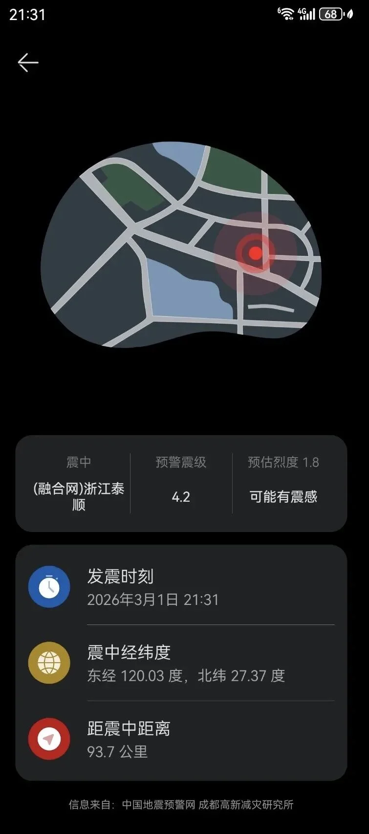 3月1日晚,不少浙江网友称,手机上弹出一则地震预警消息:21:31(融合网)浙江泰顺(E120.0,N27.4)附近发生4.2级左右地震。