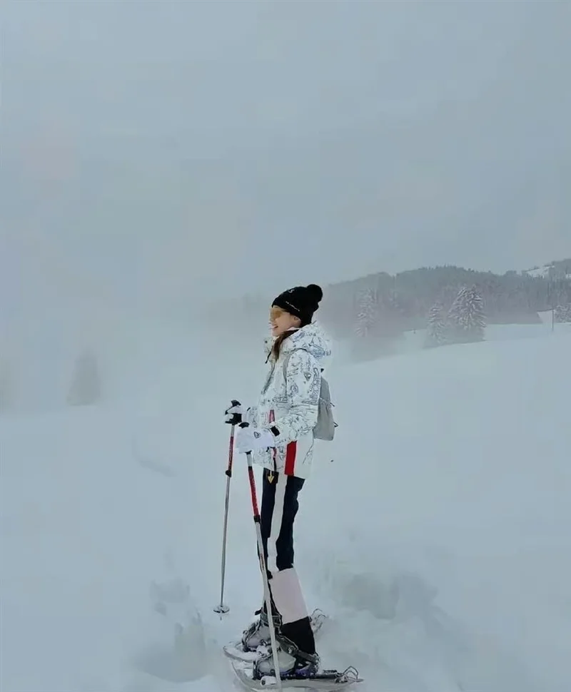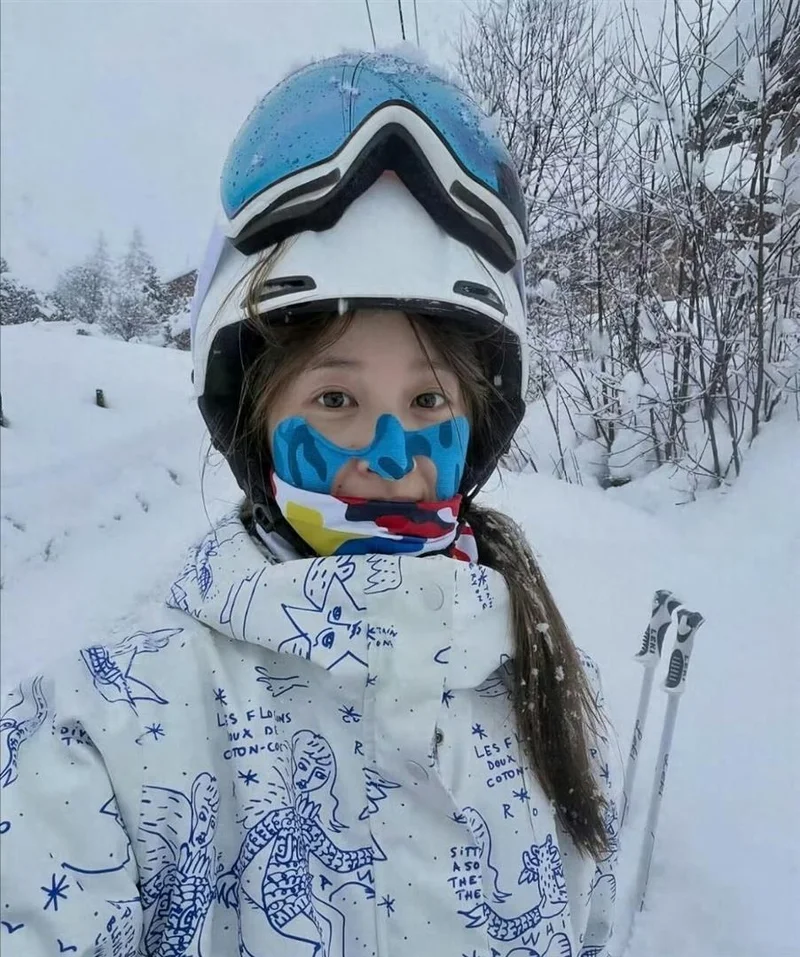 照片里她穿了一身白色带手绘的滑雪服,脸上贴着蓝色的防冻贴,打扮得倒是挺专业 。 但细看那张脸,好家伙,纯素颜出镜! 这在女明星、女富豪圈子里可太少见了。