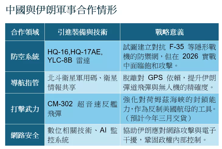专家表示,过去数年,北京在伊朗问题上玩了一场极其精巧的双面游戏。表面上,北京多次答应华盛顿将协助施压德黑兰放弃核威胁与地区挑衅,甚至在联合国表态支持部分制裁;但在实践中,北京却是伊朗生存与军扩的“总后勤部”。北京并非在解决威胁,而是在养大威胁。 透过强化与俄罗斯的战略协作,中方持续向伊朗输送精密电子组件、军规微处理器以及 HQ-17AE等先进防空系统,帮助伊朗在严厉禁运下实现军工体系的“代差升级”。更隐蔽的是,中国透过卫星情报共享(北斗系统)与反隐身雷达技术(YLC-8B),暗中构建伊朗的反干预能力,这次美方行动前,中国更刻意揭露美军部署F22的卫星照片,帮伊朗安神造势。