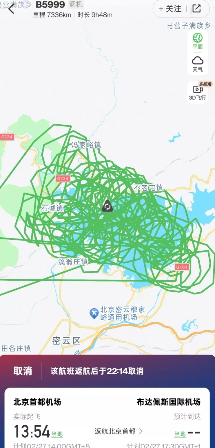 原计划从北京首都机场飞匈牙利布达佩斯的救援飞机(编号B5999)起飞不久后返航,盘旋5个小时、转了数十圈后成功降落首都机场,随后该航班显示已取消。