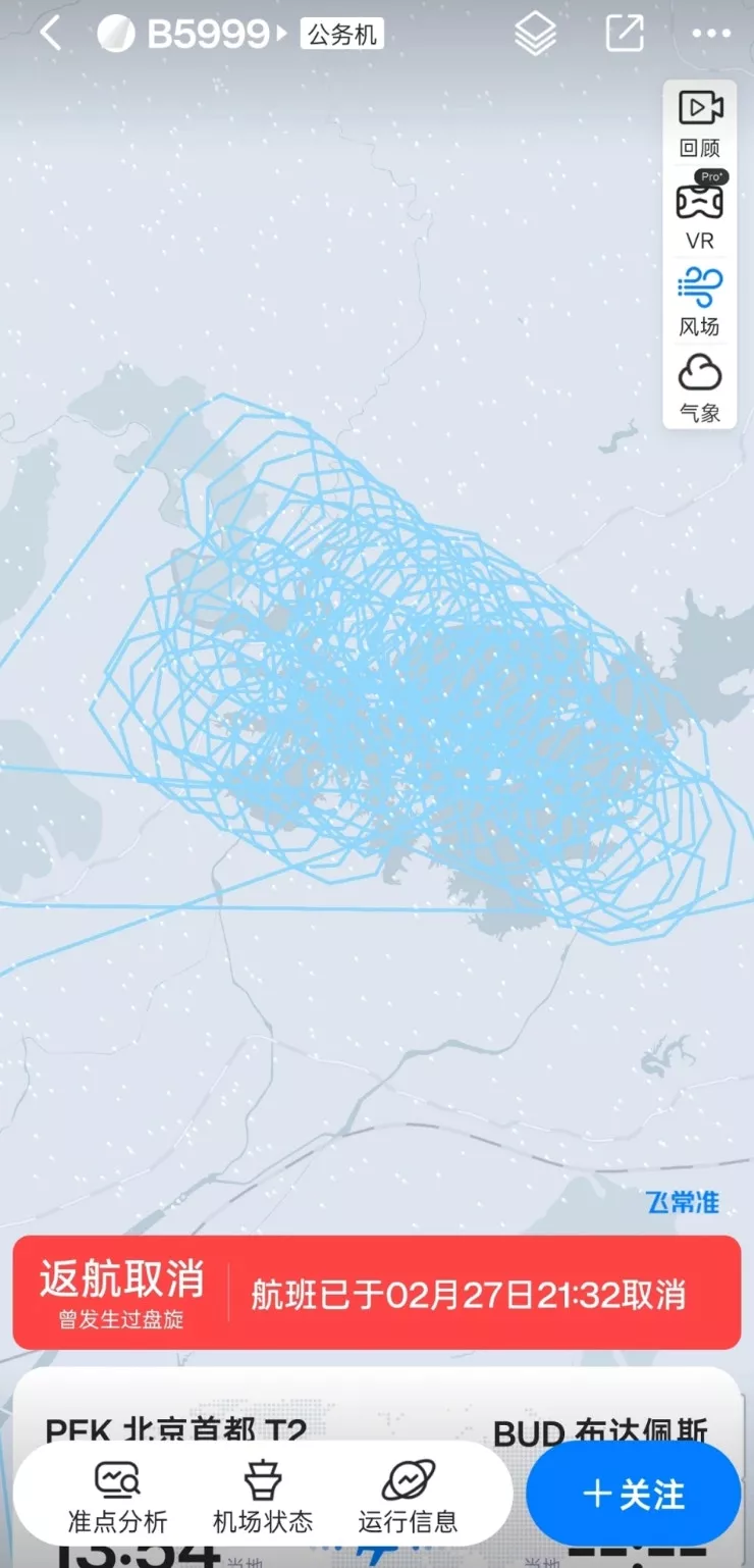 据《极目新闻》报道,2月27日下午,一架原计划从北京首都机场飞往匈牙利布达佩斯的救援飞机(编号B5999),起飞后出现突发情况,不久后返航北京,在北京市郊上空盘旋5个小时、转了数十圈后成功降落首都机场,随后该航班显示已取消。