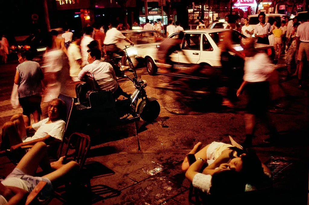 有时自然地敲门进到随机一户人家里,和上海人比手画脚地交谈几句,这些90年代的海派生活瞬间,如今看来弥足珍贵。1992年8月,一个酷热的傍晚,罗伯特走到大名路,看见居民们在路口乘凉,他回忆说自己当时又闷又热,和上海阿姨一样别了条毛巾在腰间,偶遇眼前这一幕非常动容。