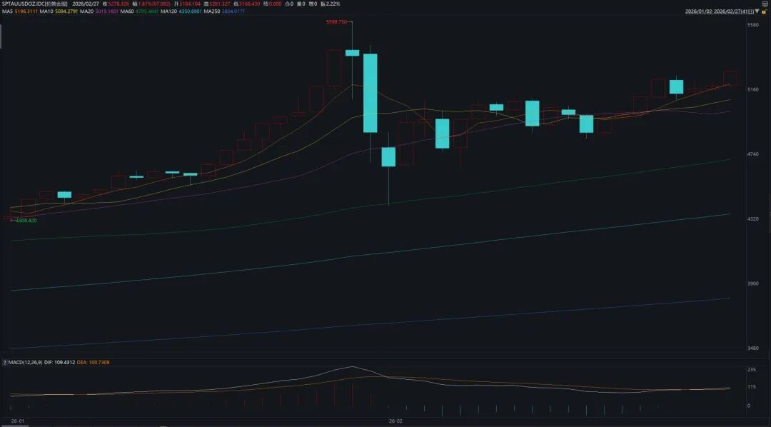 2026年以来,黄金走势在多重因素影响下进入“多空交织”态势。从国际金价看,纽约金连续在1月末触及高位后大幅回调至4700美元/盎司附近,随后逐步企稳回升,进入2月下旬,受地缘避险情绪升温等因素驱动,金价反弹势头明显。