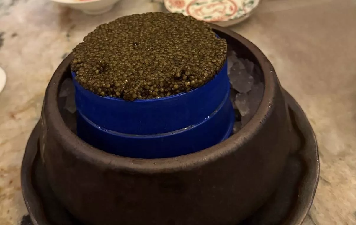 关之琳与雷林静怡以及一位男性友人相约聚会,众人吃的是高级料理,在餐桌上摆放了酒杯,里面装了香槟。喝香槟只是陪衬,主菜是餐桌上用了黑色器皿装着的蓝色圆盒里面的料理。这个蓝色的圆盒里面装的是满满的鱼子酱,属于高级食材,这就是三人相聚在一起的主菜。请客的是关之琳对坐的男士,而雷林静怡还留言称“不是一个人”,就是大家一起品尝的意思吧。