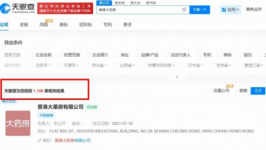 查询企业信息平台,名称里带“香港大药房”的公司已累积到1106家,存续在业的有773家,其中近三年新注册的就有449家,清一色私人股份公司