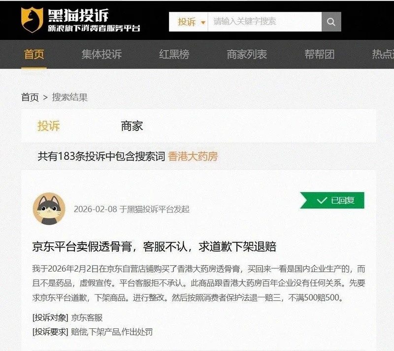 黑猫投诉平台截至2026年2月23日,含“香港大药房”搜索词的投诉183条,指向虚假宣传、无证经营、执行标准无从查询、使用后过敏等问题