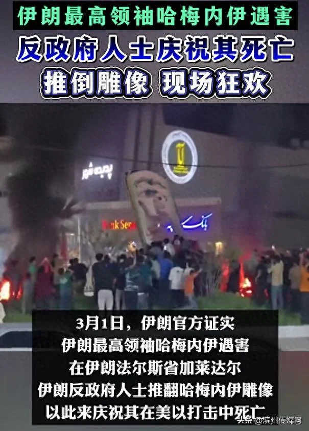 3月1日,伊朗官方证实伊朗最高领袖哈梅内伊遇害,伊朗政府宣布40天全国哀悼。在伊朗法尔斯省加莱达尔,伊朗反政府人士推翻哈梅内伊雕像,以此来庆祝其在美以打击中死亡,众人合力推倒雕像,现场爆发一片狂欢。