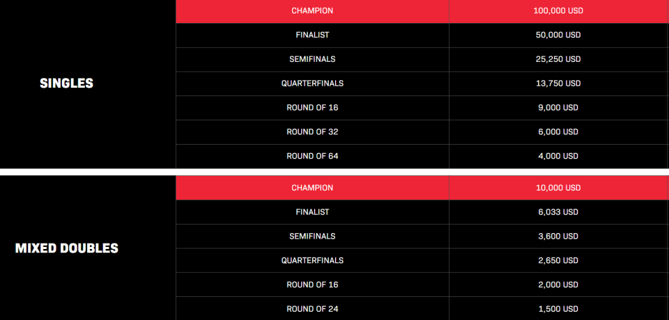 陈俊菘、温瑞博:4000美元(男单64强),约人民币2.7万元。