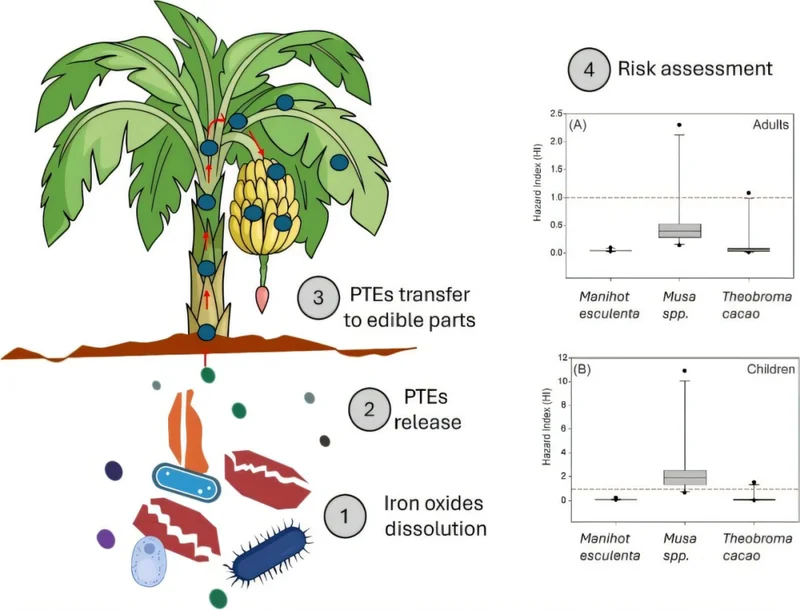 检测数据显示,可可中的铜和铅以及香蕉中的镉,均超过了联合国粮食及农业组织设定的安全上限。评估结果表明,对于成年人来说,短期食用这些农作物的健康风险指数低于1。