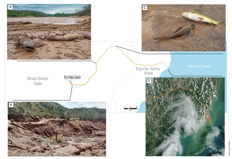 2015年11月,巴西马里亚纳的丰当尾矿坝发生溃坝,5000万立方米的铁矿废料倾泻而下,顺着多西河蔓延了600多公里,最终冲入大西洋。