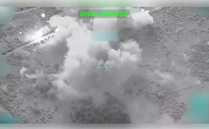 这张由美国中央司令部(CENTCOM)发布的影片截屏,随同一份描述代号为“史诗怒火行动”的新闻稿一并释出。画面显示,在一处不明地点发生爆炸后,烟尘升起。(路透)