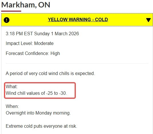 加拿大环境部发布严寒警告,一股极冷空气正席卷安省南部大部分地区,不过多伦多未被列入警告范围。环境部表示,周日夜间至周一早晨,密西沙加、宾顿、旺市、列治文山、万锦、约克区北部以及汉密尔顿等地区,体感温度预计将降至零下25至零下30度之间。