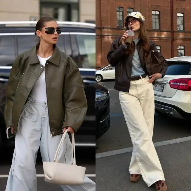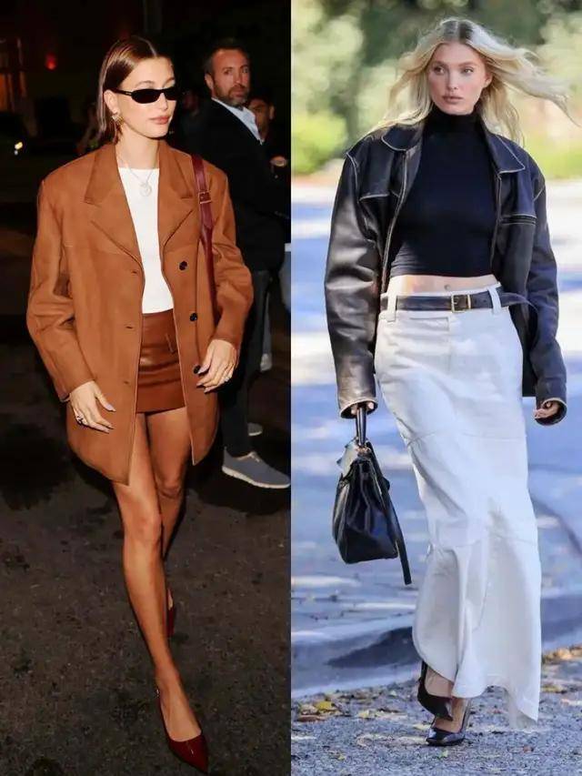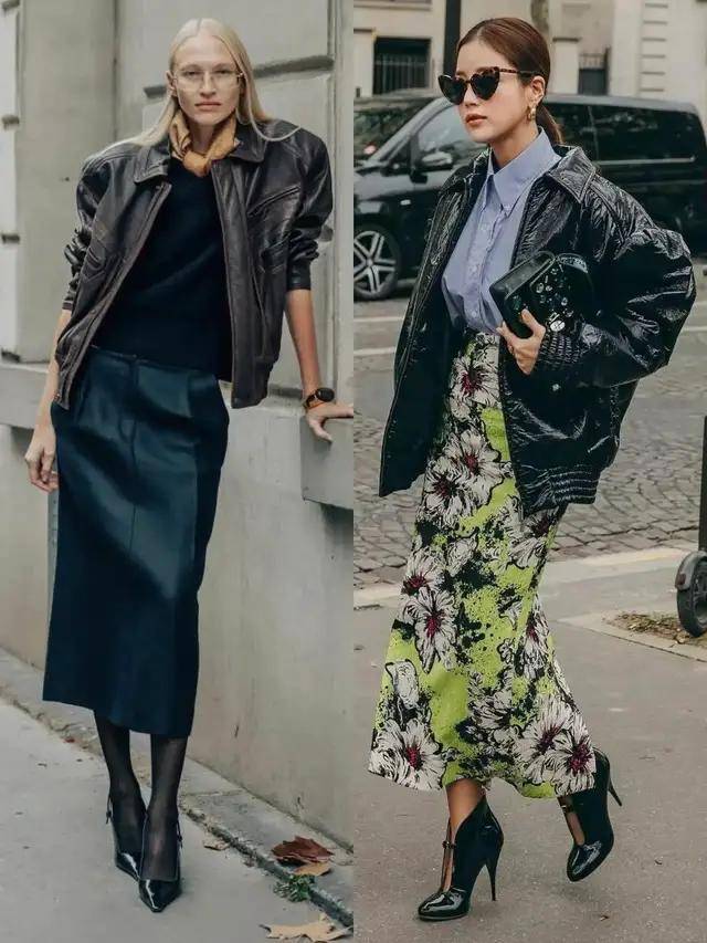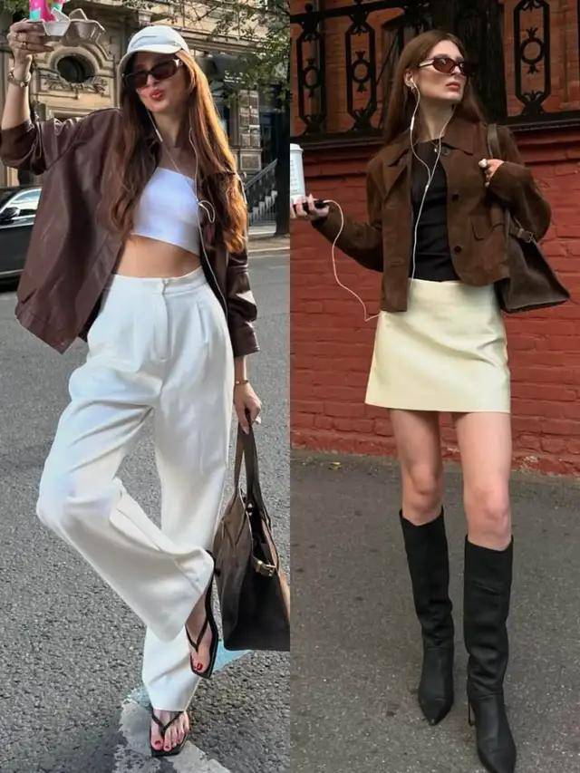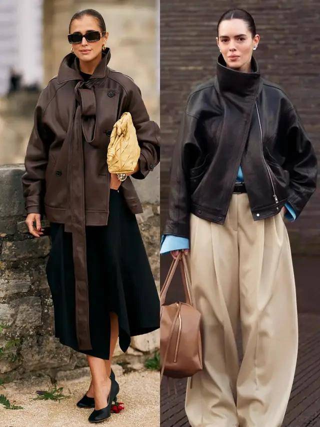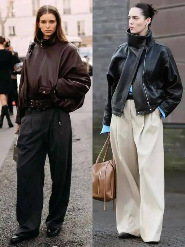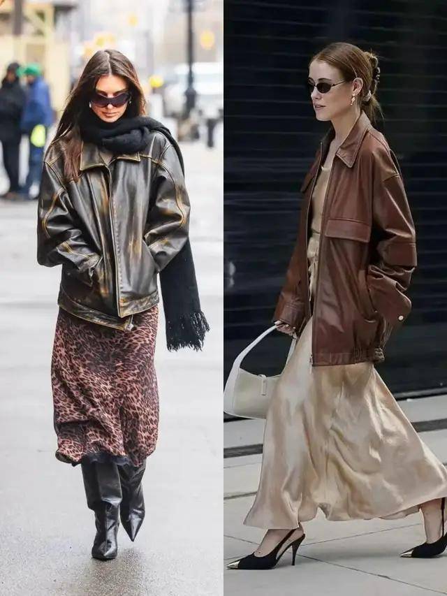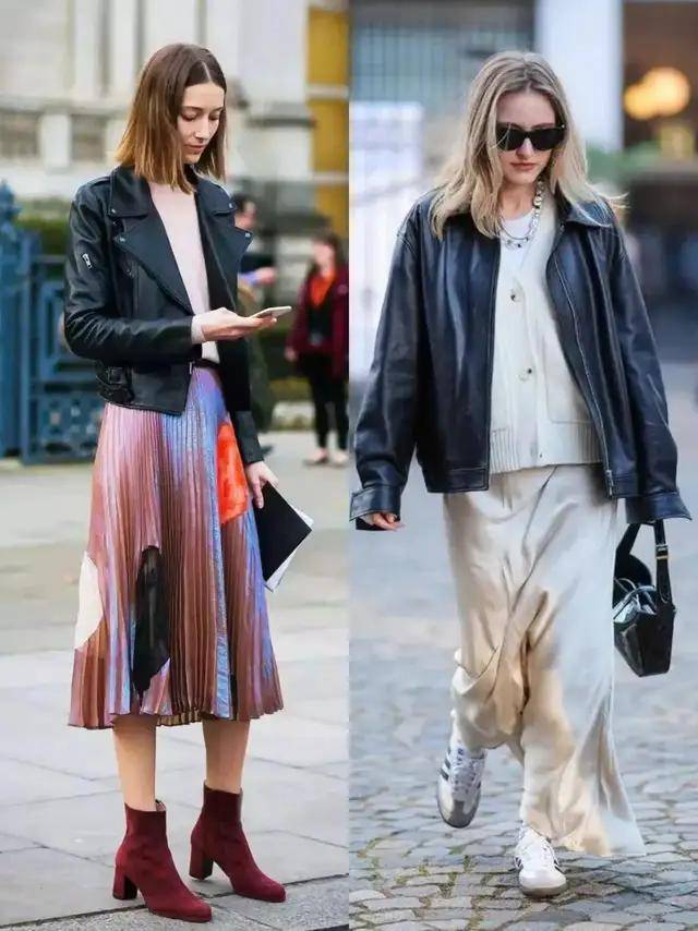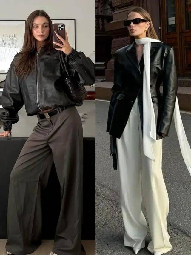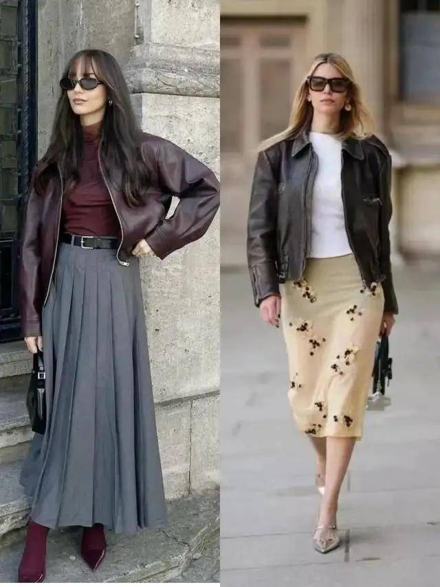 若是偏爱优雅感,可选棕色皮衣搭配黑色伞裙,脚穿黑色高跟鞋,又酷又优雅,也可以选择黑色皮衣搭配卡其色西装阔腿裤,既简约又干练。