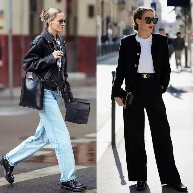 穿皮衣外套贵在简约,款式干净,线条利落,整个人才会清爽干练。下半身的裤装同样如此,配上西装裤,精致通勤,气质稳重。