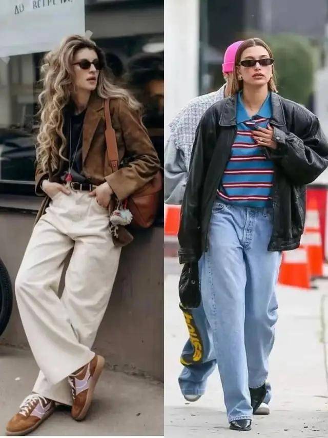 例如上面用一条白色的牛仔直筒阔腿裤搭配美拉德色系的皮衣,脚踩同色系的德训鞋。这样的穿搭有着法式慵懒的时尚感。