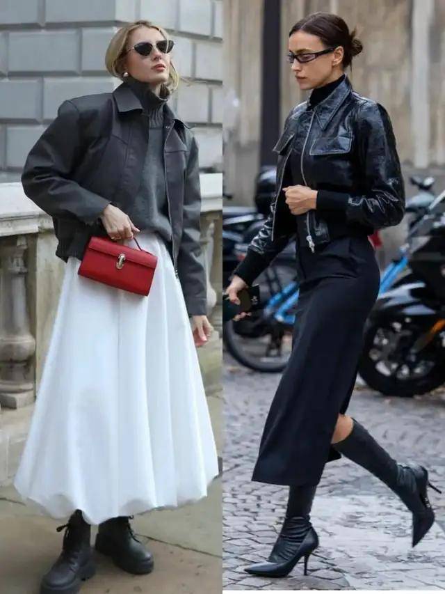 或是选择黑色皮衣内搭紧身短款针织衫,配上白色牛仔直筒半裙,露腰设计可以勾勒出咱们的小蛮腰,随性又高级,日常时尚又耐看,穿出门回头率百分百。