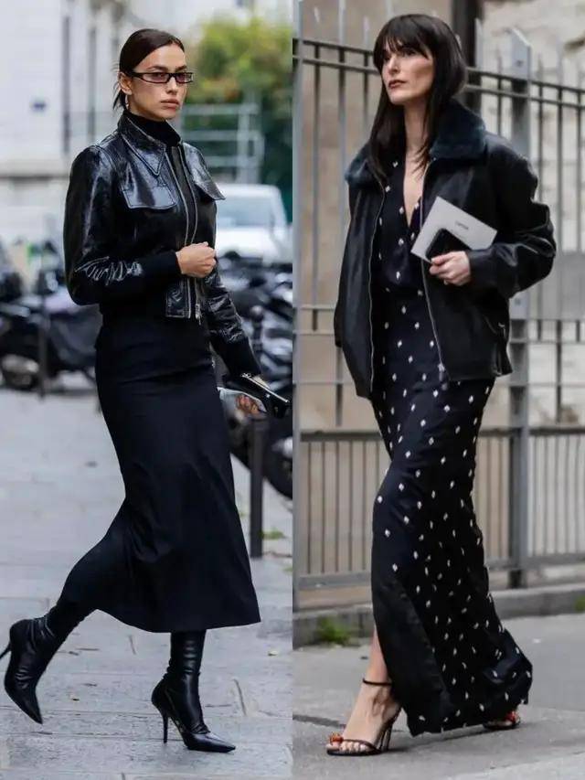 无论我们穿的是一件棕色的皮衣外套,还是黑色皮衣外套,配上一条知性长裙,慵懒法式腔调立刻就拉满。当我们搭配一条黑色皮质半裙,气场全开。