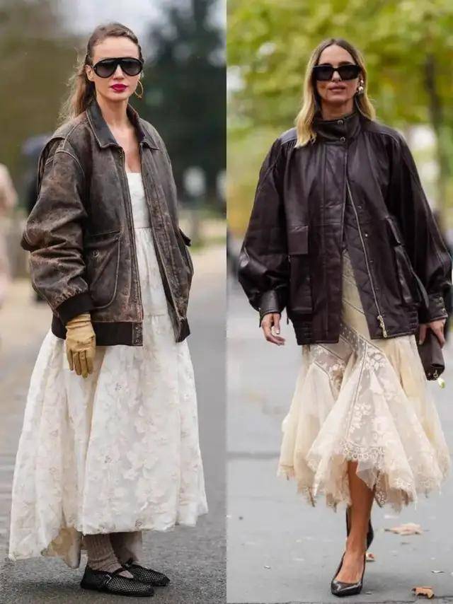 皮衣外套的妙处就在于一件外套便能解锁万千穿衣风格,好比上面用一条蕾丝刺绣的白色连衣裙来穿搭,复古摩登与现代率性完美结合。就像直接从秀场走出来,高级又惊艳。