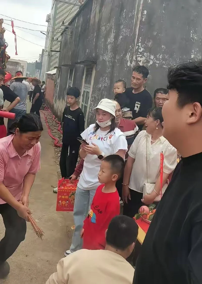 今年全红婵也回到了家里做年例,她穿了一件白色T恤,一条发白的牛仔裤,戴着墨镜站在人群中等到游神队的到来。过了一个年,感觉她胖了不少,人气也没有以前那么旺,大家都好像不太惊讶会偶遇她。