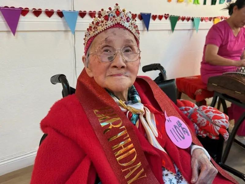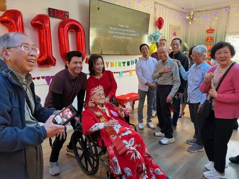 洛杉矶华裔人瑞施冰娥日前在于斌枢机纪念安养院欢度110岁生日。(记者杨青╱摄影)
