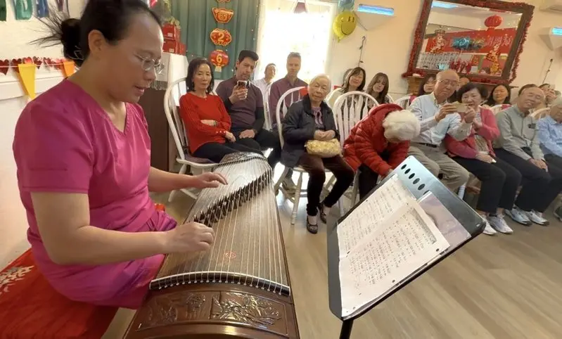 于斌枢机纪念安养院护士演奏古筝为110岁人瑞施冰娥老奶奶庆生。(记者杨青╱摄影)