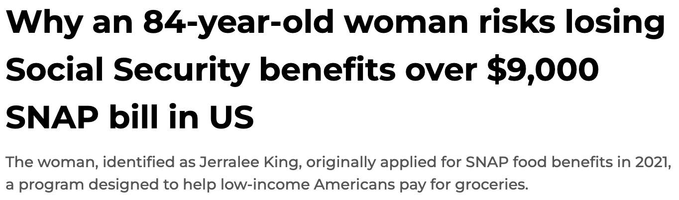 一名84岁的老人正经历一场突如其来的财务打击。她因政府系统错误,多领取了近9000美元的“补充营养援助金(SNAP,俗称粮食券)”,如今不仅福利被终止,还被要求全额偿还。更让人难以接受的是,这笔“债务”将通过扣减她每月的社会保障退休金来收回。对依靠固定收入独居的高龄老人来说,这无异于晴天霹雳。