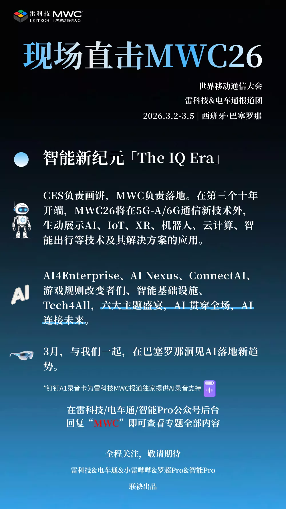 MWC(世界移动通信大会)26主题是智能新纪元「The IQ Era」,将在5G-A/6G通信新技术外,生动展示AI、IoT、XR、机器人、云计算、智能出行等技术及其解决方案的应用。