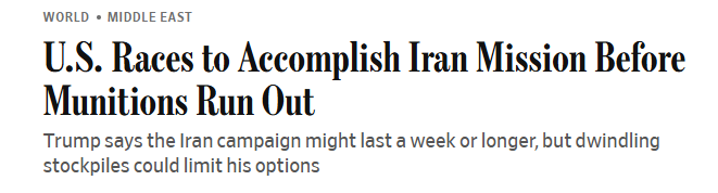 现任和前任官员及分析人士表示,美军正在因弹药储备问题而面临考验,因为美国正争分夺秒地摧毁伊朗的导弹和无人机部队,以免拦截器耗尽,从而无法抵御伊朗的反击。