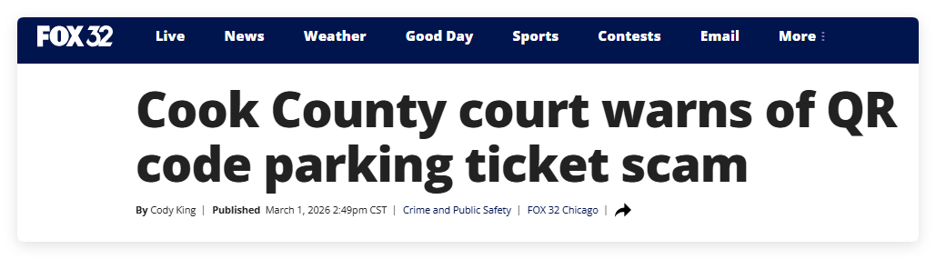 官员提醒,如果您收到一封声称来自库克县巡回法院(Cook County Circuit Court)的通知,要求您扫描二维码并支付未缴的停车罚单,请务必警惕——这是一场骗局。