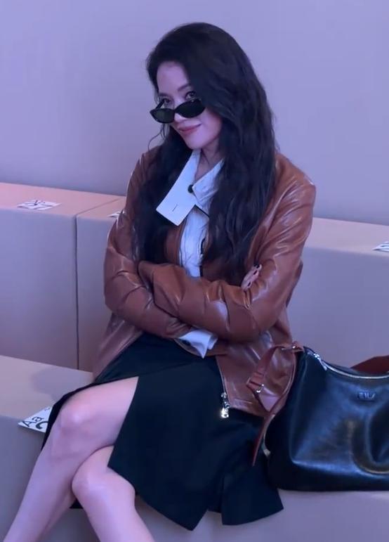 而到了FILA大秀上,舒淇又换了另一套装扮,复古棕色皮衣和灰色半身裙的搭配很有秋冬氛围,波浪卷发披在肩膀上,看起来温柔强大,极具女人味。