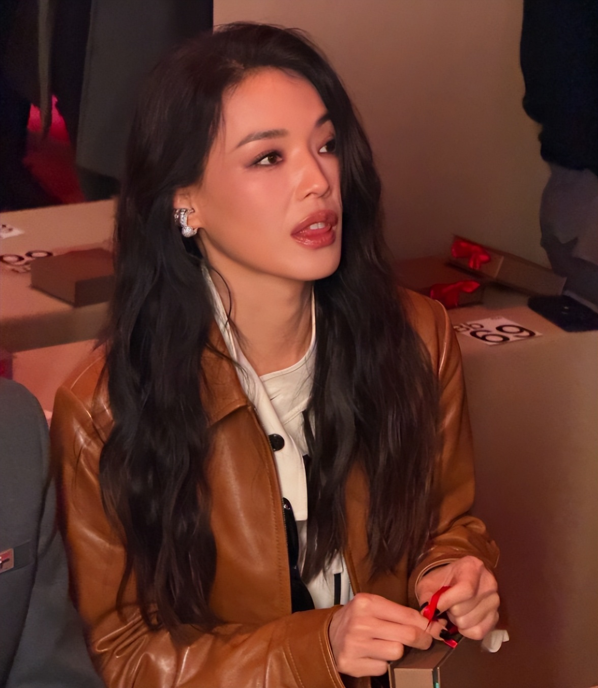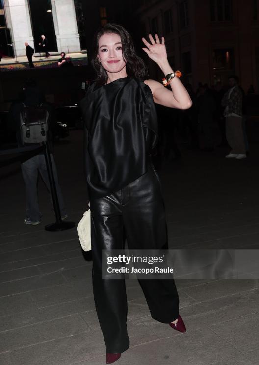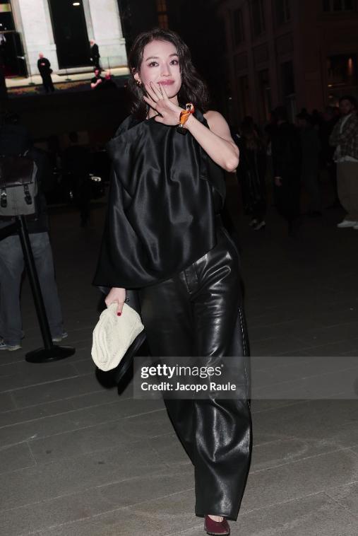 先说Bottega Veneta大秀,舒淇作为全球大使压轴出场,丝缎露肩上衣搭配亮面皮裤,全黑色系穿搭将冷艳感直接拿捏。