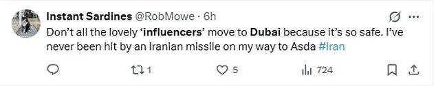 相反,一阵阵冷嘲热讽铺天盖地而来。一名网友在社交平台上冷冷地写道:“那些可爱的网红不都说搬去迪拜是因为那里很安全吗?话说,我每天去超市买菜的路上,可从来没被伊朗导弹袭击过。”