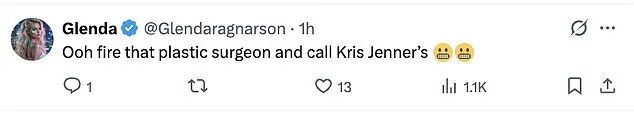 甚至还有人把卡戴珊家的太后克里斯·詹纳也扯了进来,调侃道:“金·凯瑞应该赶紧炒掉现在的整容医生,去问问克里斯·詹纳在哪儿做的拉皮,那才是顶级水准。”