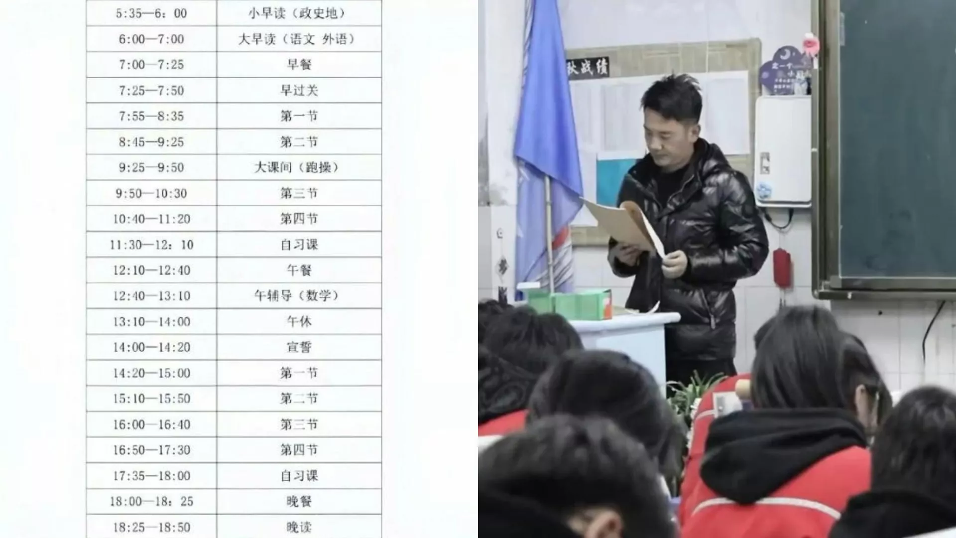 据《大风新闻》报导,依网传作息表显示,学生每天的日程几乎被学习填满。早晨5点35分开始自习背书,早餐仅有25分钟,午餐和晚餐分别为30分钟与25分钟,午休仅安排30分钟,甚至还有20分钟的宣誓时间。晚上10点后,住校生需在20分钟内完成洗漱,随后继续晚自习至23点20分,而走读生则需上课至23点10分。