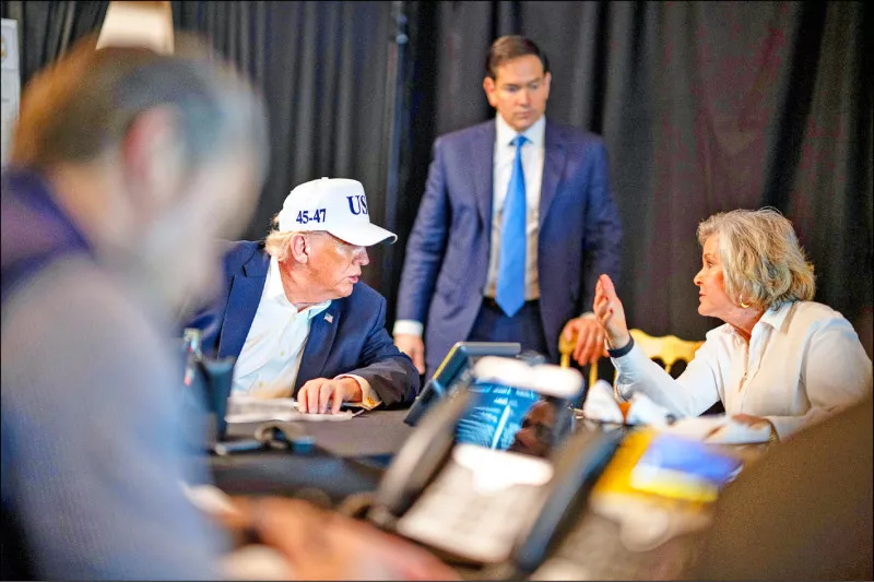 美国总统川普透露,针对目前对伊朗展开的军事行动,他已备妥若干“退场机制”。图为川普(左)2月28日在佛罗里达州海湖庄园,与白宫幕僚长威尔斯(右)交谈,中为国务卿卢比奥。(美联社)