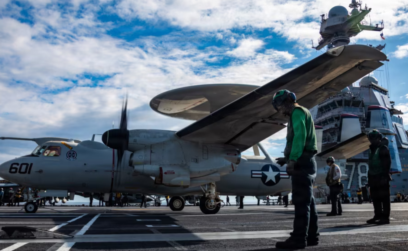 2026年3月1日,美国海军水兵观察一架E-2D鹰眼预警机接近弹射器,准备从世界上最大的航空母舰“杰拉尔德·R·福特”号(CVN 78)的飞行甲板上起飞,以支援“史诗狂怒行动”。