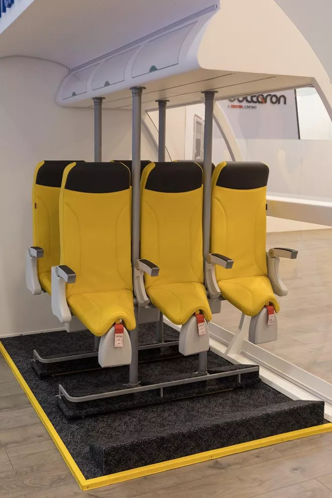 2018年汉堡飞机内饰博览会上展出的站立式座椅概念模型。该设计通过马鞍形坐垫迫使乘客保持"半站立"姿态,将座椅间距压缩至极限,以实现机舱空间利用率最大化/ Wikimedia Commons