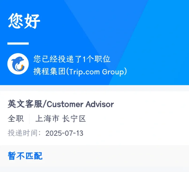 西兰给携程英文客服岗投去简历后,通过了一轮面试和笔试。去年10月,她参加了第二轮面试,HR一上来就问她,“你的留学经历在哪里?”西兰只能尴尬地解释自己没有留过学。她没能通过这场面试。