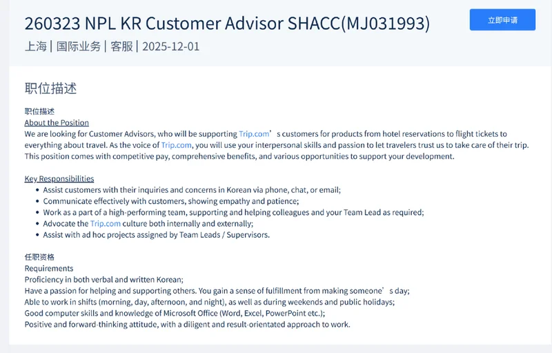 携程官网上,国际客服中的一类岗位被称作Customer Advisor(客户顾问)。职位描述里写着,你作为“Trip.com的形象大使”,“将运用你的人际交往能力和热情,让旅行者信赖我们,将他们的旅程交给我们安排”。