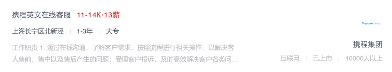首先是极具吸引力的薪资。招聘网站上显示, 携程英文在线客服岗位的薪资在11000元到14000,且有13薪。这个薪资高过了一些互联网大厂的初级运营岗,部分“大模型标注”“AI训练”岗,以及许多咨询公司的助理岗位薪资。