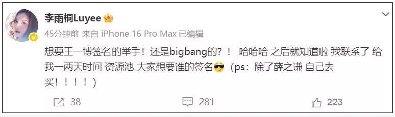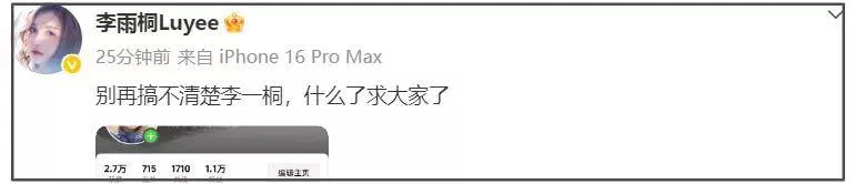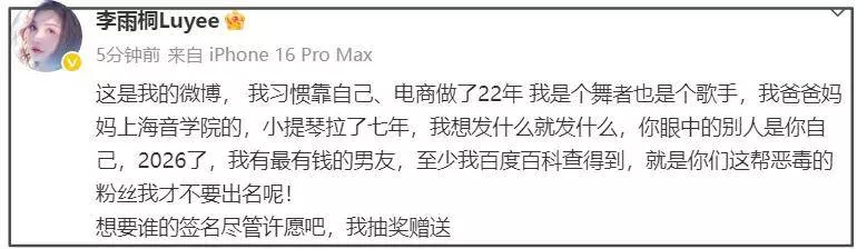 胡乱吐槽了一番后,李雨桐分享自己的社媒账号,让大家不要找错人了,不要分不清李一桐和李雨桐。而这之前,她还声称自己手里有王一博、Bigbang等明星的签名照博关注,被质疑炒作热度。