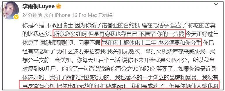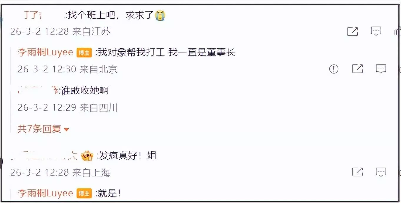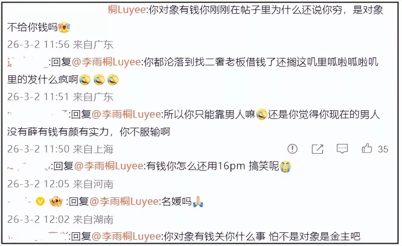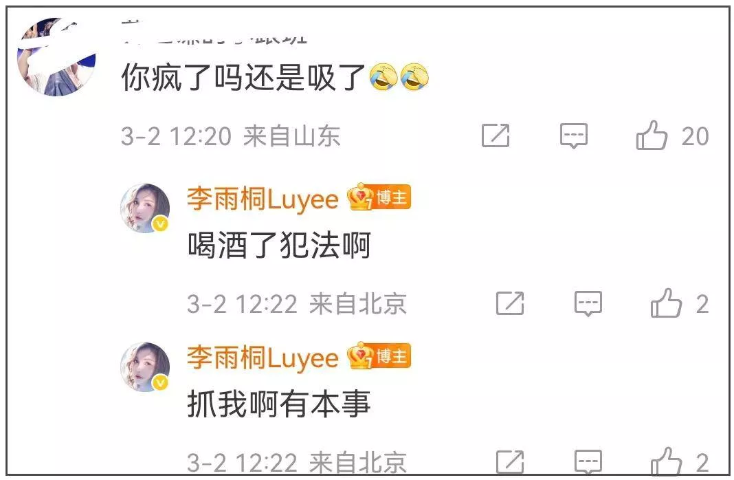 看到李雨桐不晒证据只顾自己高兴,不少吃瓜网友的耐心耗尽,让她没事儿上个班。她则表示自己的微博想咋发咋发,一会儿是自己有最有钱的男朋友,一会儿是男朋友给自己打工,自己是董事长,整个就是逻辑混乱。也因此被质疑喝醉了,她怒怼“喝酒犯法啊”,随后删除了所有内容。