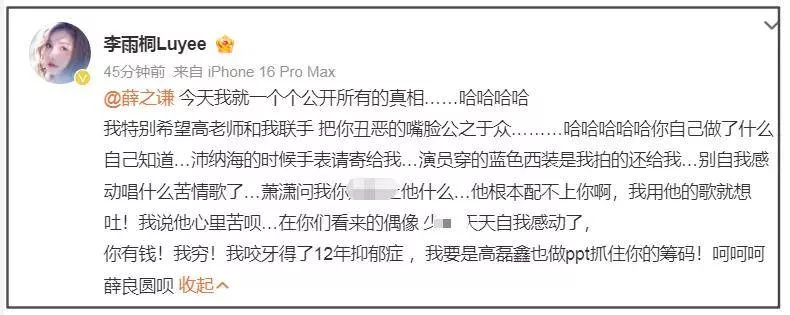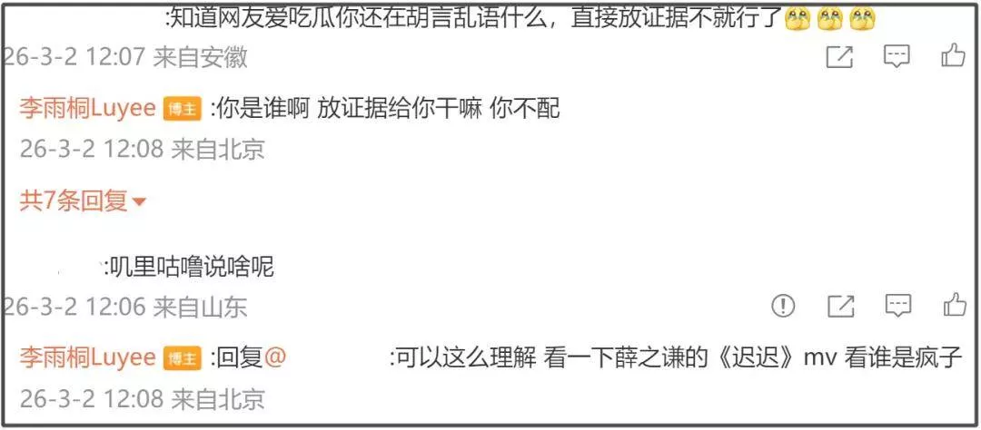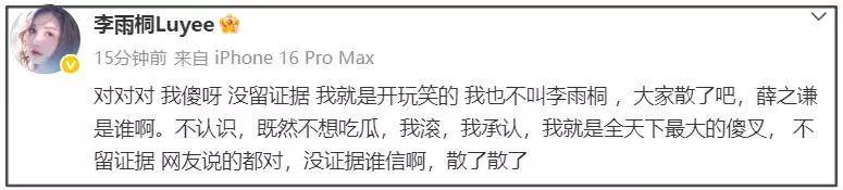 看到李雨桐语无伦次的爆料,有网友让她放证据,她晒了自己的照片,让大家别急等着。之后,又一副嘲讽的口吻表示自己不认识薛之谦,也没证据。