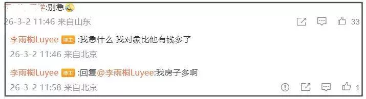 有网友看到李雨桐似乎自暴自弃了,她表示自己没急,突然又说自己对象比薛之谦有钱,并且自己房子多。看起来完全破罐子破摔的样子了。