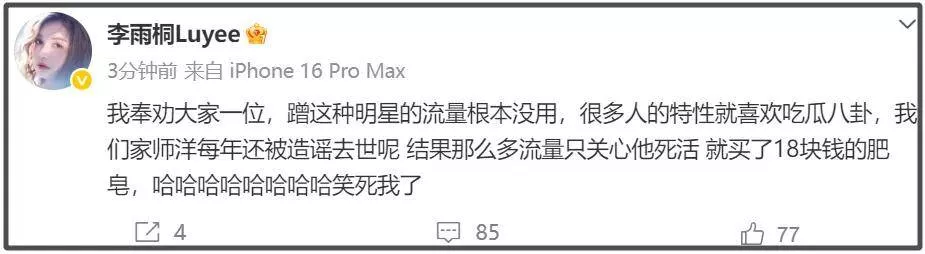 或许是被骂蹭流量了,李雨桐急忙解释,称这种八卦瓜并没有用,还拿师洋举例,泼天的流量只卖了18块钱的肥皂。但是却一直不松口放证据,只是反复怒斥薛之谦跟妻子坑害了自己,两人把她套空,然后美美复合了,她却被搞患上抑郁症12年。