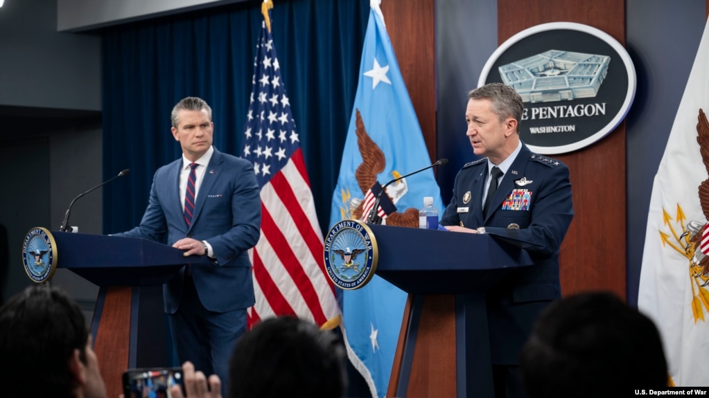 战争部长海格塞斯(左)和参谋长联席会议主席凯恩于2026年3月2日在五角大楼就“史诗狂怒行动”举行新闻发布会。