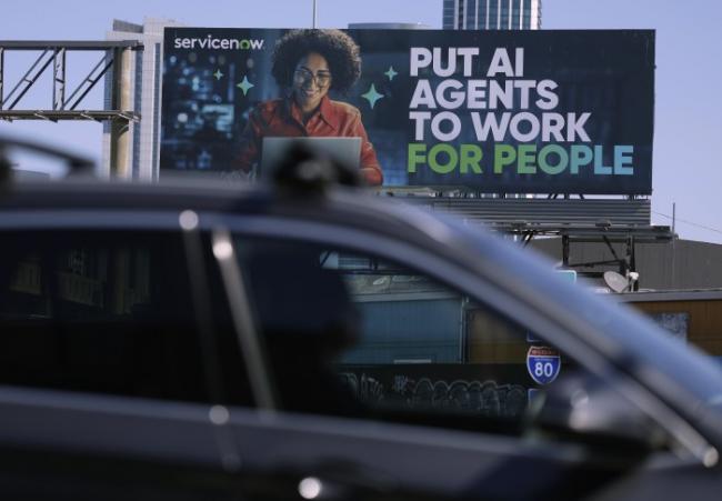 去年旧金山一家人工智能公司的广告牌广告语气积极向上,“让人工智能体为人而工作”。图片来源:JUSTIN SULLIVAN/GETTY IMAGES