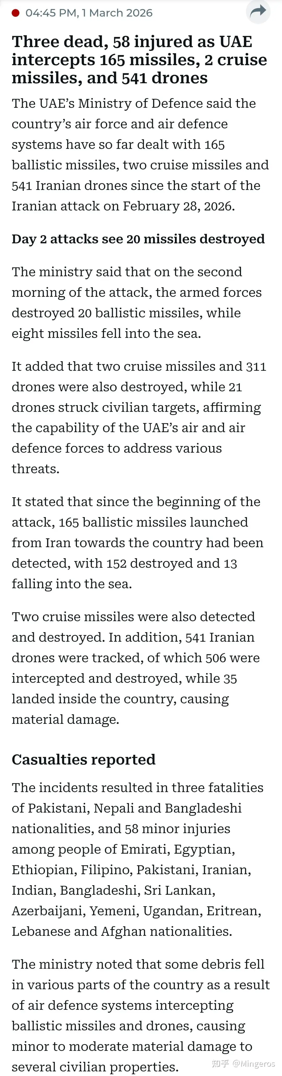 3 月 1 日更新:阿联酋国防部宣布 2.28 以来伊朗向阿联酋发射 165 枚弹道导弹、2 枚巡航导弹、541 架无人机,导致 3 名南亚外劳死亡,58 名含伊朗在阿平民的民众受伤,另有财产损失。