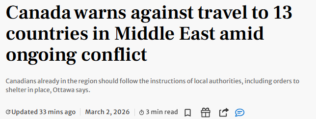 政府指出,已在这些国家的加拿大人通常应遵循当地当局的指示,就地避险或在安全情况下撤离,并留意航班及边境政策变化。