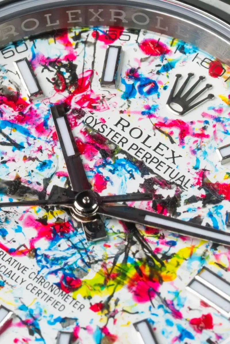 你没看错,就是让苍蝇在劳力士表盘上又吐又拉,完成一幅“艺术作品”。